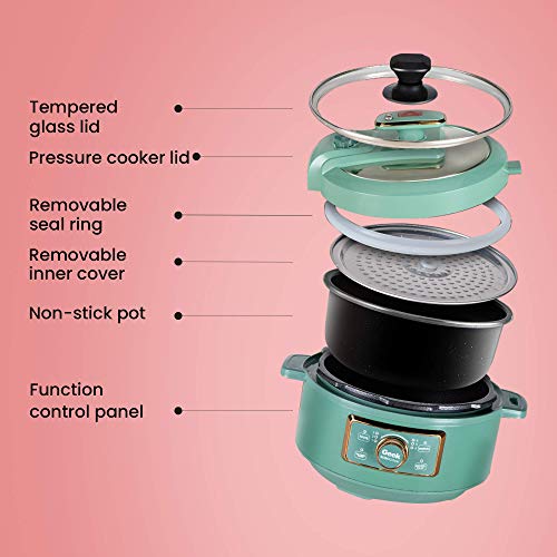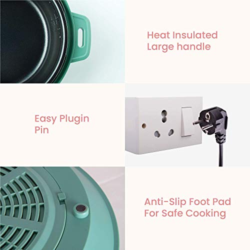 EXEMPLARY BUILT : Durable Non- stick 3 litres inner cooking pot suits best for small family. Large insulated handle with anti-skid base is an added safety. Comes with additional tempered glass lid, silicone mitts, measuring cup and spatula to serve your purpose.