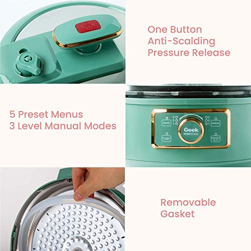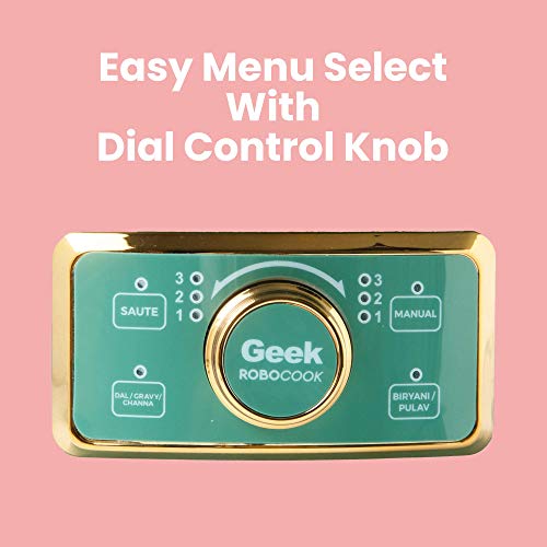 5 PRESET MENU : Cooking doesn€t have to be monitored anymore! Geek Robocook Glam automatic instant pot is featured with 5 preset menus which includes Dal, Channa, gravy, Biryani and Pulav. Press and the food is ready to serve your dinning.