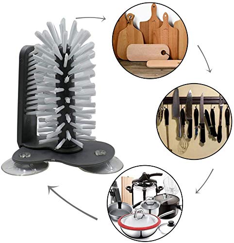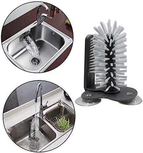 ★ SUCKERS: There is three big suction cups at the brush bottom, Suction grip base firmly attaches to the wall table or or attaches to the bottom of sink, just slide glassware between the two sets of bristles, convenient to use and cleaning.