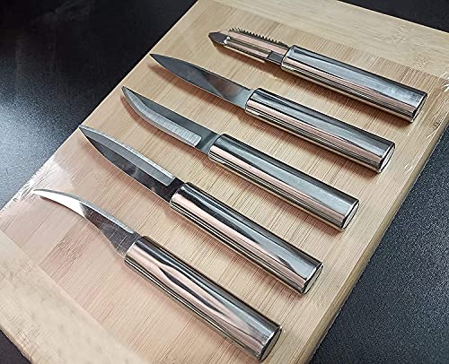 ackage Content : 1 Stainless Steel Tomato Knife, 1 Stainless Steel Steak Knife, 1 Stainless Steel Multipurpose Knife, 1 Stainless Steel Carving Knife, 1 Stainless Steel Vegetable Peeler,1 Pcs Wooden Stand