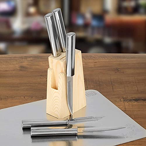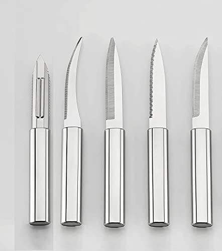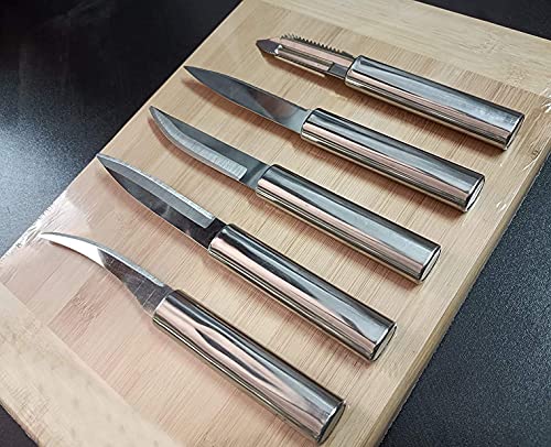 Package Content : 1 Stainless Steel Tomato Knife, 1 Stainless Steel Steak Knife, 1 Stainless Steel Multipurpose Knife, 1 Stainless Steel Carving Knife, 1 Stainless Steel Vegetable Peeler,1 Pcs Wooden Stand