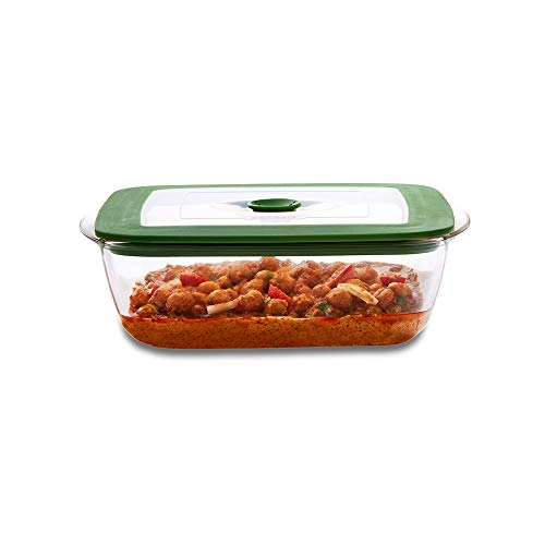 Borosil Microwave Safe and Oven Safe Square Glass Baking Dish with Green Lid, 2.2 L, 1 Count, Transparent
