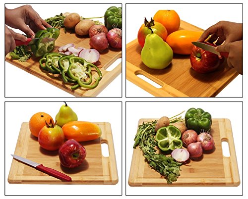 DURABLE & SAFE – Perfect for vegetable chopping, slicing fruits, cutting meat, bread, cheese, herbs and more. High quality bamboo resists knife cracking and warping. Rounded corners and edges makes for easy handling.