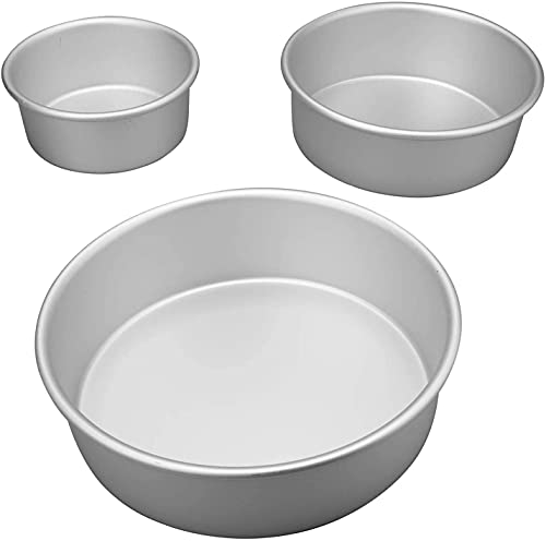 Our aluminum baking pans round set are perfect for making supreme multi-layer cakes and many more professional creations and recipes. Ideal design for round tiered and layered cakes, cheesecake, ice cream cakes, casseroles, deep-dish pizzas, gelatin desserts, tiramisu and so many more savory recipes. Product Specifications: Set of 3 Round Cake Pans include: 6” in diameter by 2.5” height round cake pan 7” in diameter by 2.5” height round cake pan 8” in diameter by 2.5” height round cake pan CARE INSTRUCTIONS: Wash each round cake pan with warm water, mild soap and a soft sponge before first use and after every use. Round Cake Pans are NOT Dishwasher Safe. After washing, dry immediately with a dry cloth or paper towel to prevent limescale formation. Give it a try and don’t miss out on this High-Quality round cake mold set that will make your cooking stylish and very convenient!