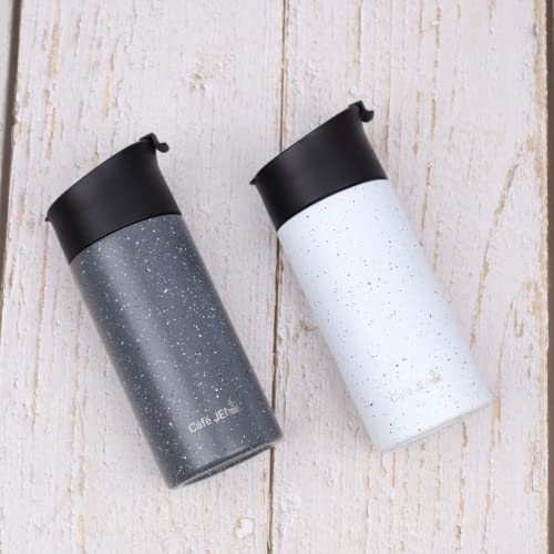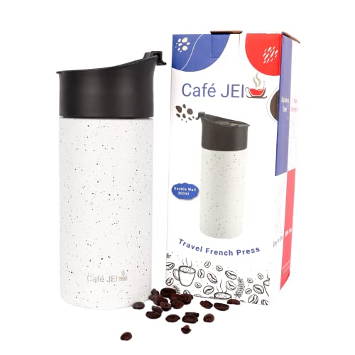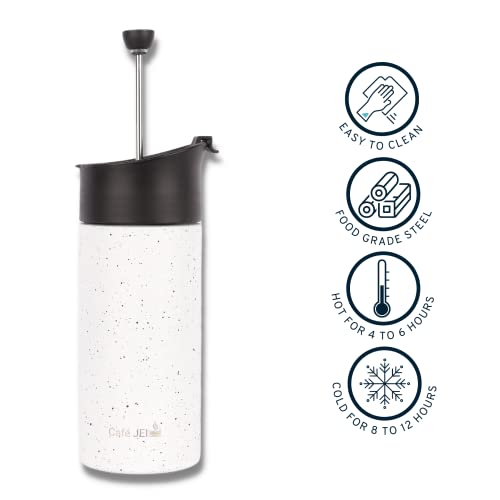 Cafe JEI Travel French Press Mug, Stainless Steel Double Walled, Vacuum Insulated Thermos for Hot or Cold Coffee, Tea, Anti-Slip Grip, Coffee Press Tumbler With Flip-Top Sipper Lid (300ml, Marble White)