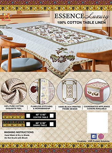 SPECIFICATIONS OF THE FABRIC : The Cotton Used in Heritage Table Cloth is 20 X 20, 60/56, One of the quality of Raw Cotton Sheeting Fabric Manufactured in India. Its is due to the beauty of the Fabric that the shightest of the colouts come live on it