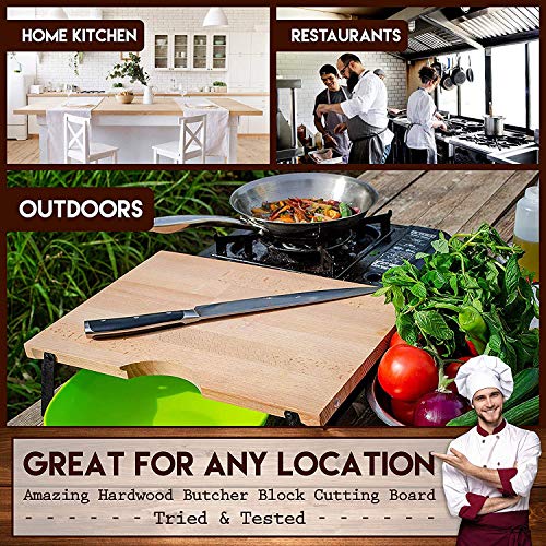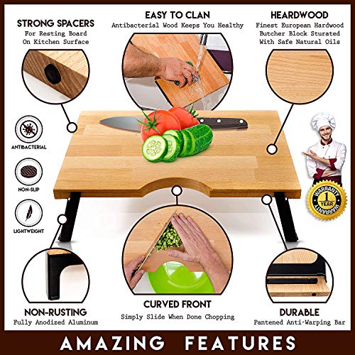 BUILT TO LAST: Unlike bamboo cutting boards that easily warp, we’ve crafted ours from knife-friendly Hardwood ( wood), pre-oiled it for moisture resistance, and fitted it with anti-warp metal bars you won’t find in 99% of wood cutting boards. (Handwash recommended) NO MORE BACK PAIN: Chop, mince, and dice in total comfort. With foldable feet, the wooden cutting board allows you to chop standing upright for reduced back pain. BUILT TO LAST: Unlike bamboo cutting boards that easily warp, we’ve crafted ours from knife-friendly European Hardwood (Beech wood), pre-oiled it for moisture resistance, and fitted it with anti-warp metal bars you won’t find in 99% of wood cutting boards. (Handwash recommended)