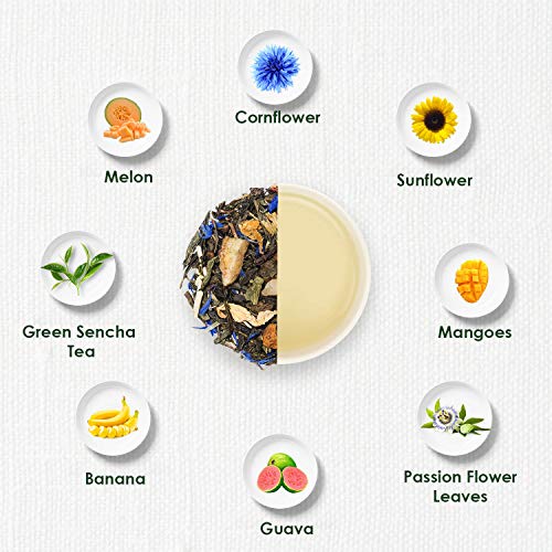 Taste: Cheery notes of bananas, mango, melons and guava hit your palate as you take in the first sip of this super fruity blend followed by floral nuances of sunflowers and cornflowers. A fruit bomb! Health Benefits: Improves immunity, increases metabolism, Aids weight loss, Fights obesity
