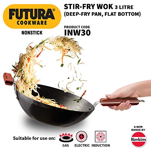 Hawkins – Q41 Futura Non Stick Dosa Tawa, 33cm, BlackThe Dosa Tava is designed with just the right curvature and thickness to give you the best cooking results when making dosa (rice and gram pancakes). The flange, which firmly attaches the handle with strong stainless steel rivets, is uniquely designed to not interfere with the cooking surface and to hence maximise the cooking area, allowing you to make a very large dosa, or several uttapam or cutlets at one time. The 4.88 mm extra thick heavy gauge metal ensures fast and even heat conduction and retains heat well. The Dosa Tava Instruction Manual has 11 tested recipes for the Dosa Tava, including four varieties of dosa, uttapam, cutlets and rolls. The Dosa Tava is suitable for domestic gas and radiant electric cooktops. Diameter (cm): 33 Thickness (mm): 4.88 Carton Dimensions (WxDxH) : 493 x 349 x 88 mm m Product weight in Carton : 2.04 KgHawkins – IQ-73 Futura Non-Stick Stir-Fry Wok 3 Litre Without LidAll but one of the Futura Nonstick Deep-Fry Pans have a round bottom and two short handles. The exception is then 2 litre Deep-Fry Pan (Stir-Fry Pan) with a flat bottom and a single long handle. The round bottom pans are also eminently suitable for stir-frying. The Breakfast Pan (Appachatty) with 0.9 litre capacity, round bottom and two rosewood handles, is ideal for the quick cooking of a variety of Indian and Western breakfast dishes.