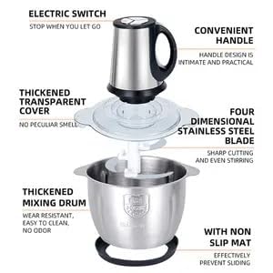 you just need to put the ingredients in the container of the mini chopper and the meat can be delivered quickly which is convenient and fast And it is easy to clean can be disassembled quickly and in seconds and can be thoroughly cleaned after rinsing REMINDER washing the engine is strictly prohibited The blade is sharp please use it carefully to avoid cuts