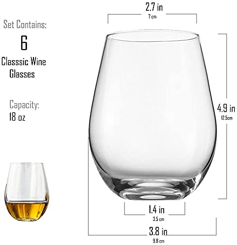 18 oz Classic Stem-Less Wine Glasses Set of 6 Large Size for Red White Wine Drinkware Tumbler Cup Ideal for Iced Tea Cocktail Juice Water Kitchen Glassware Beach Wedding Summer Dinner Everyday use