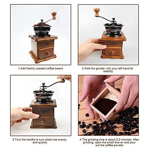 Easy to operate, putting coffee beans inside bowl and turning handle repeatedly, then ground coffee will fall inside the drawer.