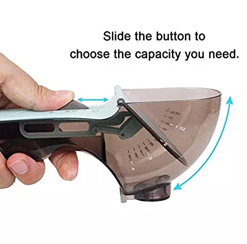 Measurement range: 5ml-30ml (0.17oz-4.40oz), 1/8 cup- 1/2 cup; It combines cup, teaspoon and tablespoon to meet different needs. Push the button to get the reading.
