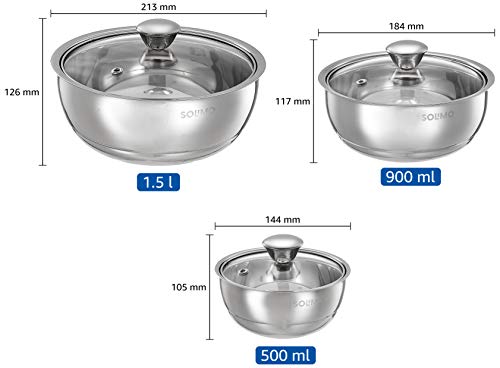 Package Contents:- Solimo Stainless Steel Double Walled Insulated Serving Bowls, Set of 3, Capacity: 500 ml, 900 ml & 1500 ml