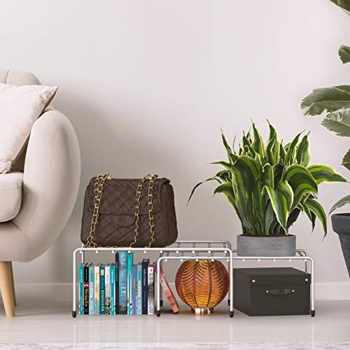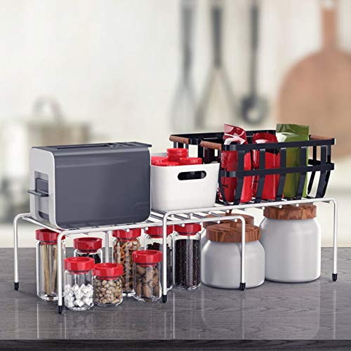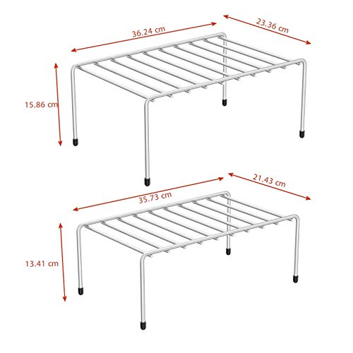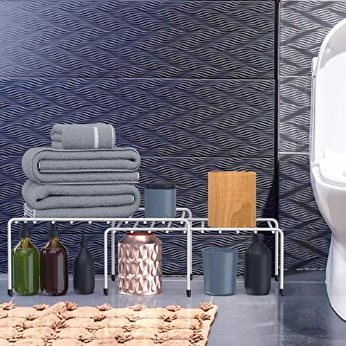 EXPANDABLE: Featuring two shelves that can effortlessly be customized to fit your desired length. Additionally, the overlapping shelf design adds more space when not in use.