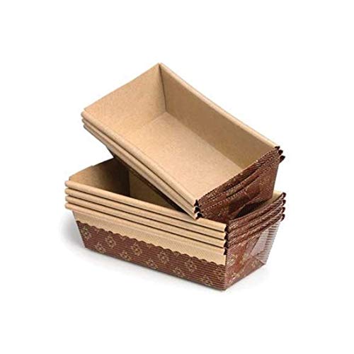 standing rectangular paper loaf mold suitable for 200 gm. Constructed with a corrugated sidewall and base. The mold has a brown background with a gold floret print overlay. Oven safe in temperatures up to 390 f. Place molds on baking sheet for additional support in the oven. Microwave and freezer safe. Grease and warp resistant. Suggested uses: cake quick bread crumb cake.