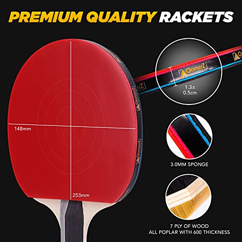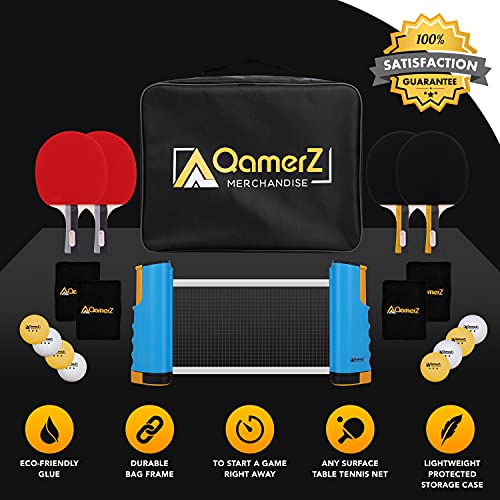 AQamerZ Complete Ping Pong Paddle Set – Portable Table Tennis Kit with Retractable Net, 4 x Ping Pong Paddles, 8 Balls, 4 x Sweat Bands, Carry Case – Tabletop Pingpong Racket Equipment and Accessories