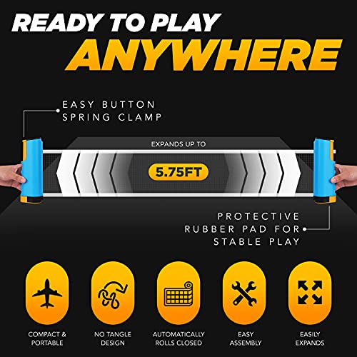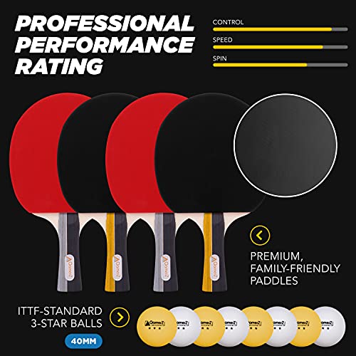🏓 GAME, SET, AND MATCH! Work on your ping pong skills with this table tennis set of 4 table tennis paddles, 8 balls (2 more than most table tennis paddle sets), 4 sweatbands and 1 retractable table tennis net 185cm, which won’t snap easily.