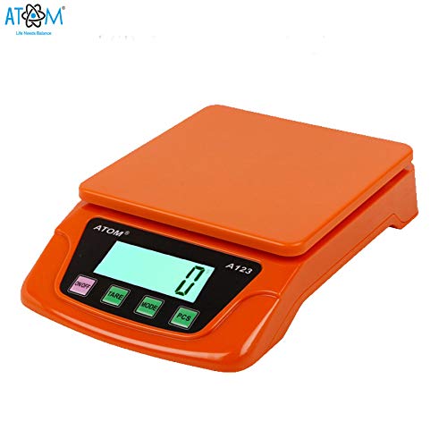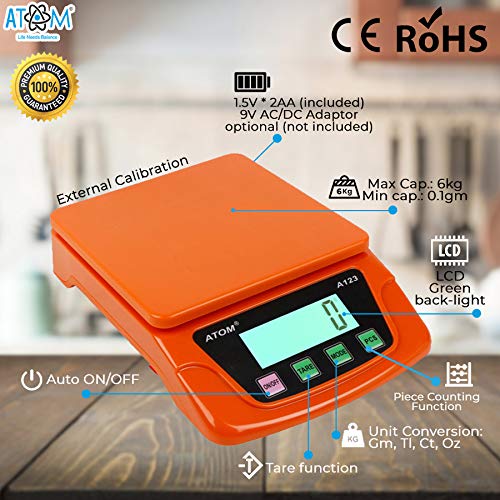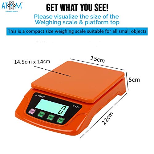 # Atom A-123 is suitable for measuring upto 6 Kg of Fruits,Spice,Food,Vegetable and more,Outside Calibration,Auto Shut Down,Large L C D Backlight Display (5 digital 20mm height),Large Platform,Counting Function,Tare full capacity,Low battery Indication