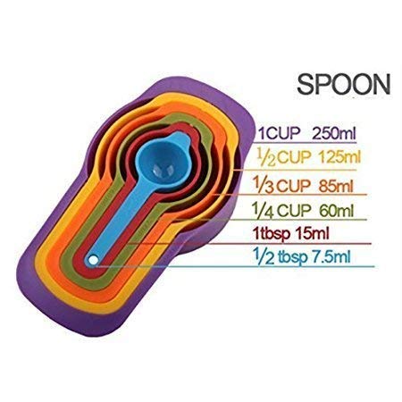 Space-saving design, cups snap together securely. Additional spoon in the centre, allowing measurements from 1 teaspoon (5ml) up to 1 cup (250ml). Handles are long and have a hole for better grip. Food grade quality and dishwasher safe.