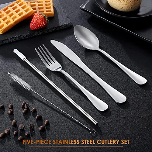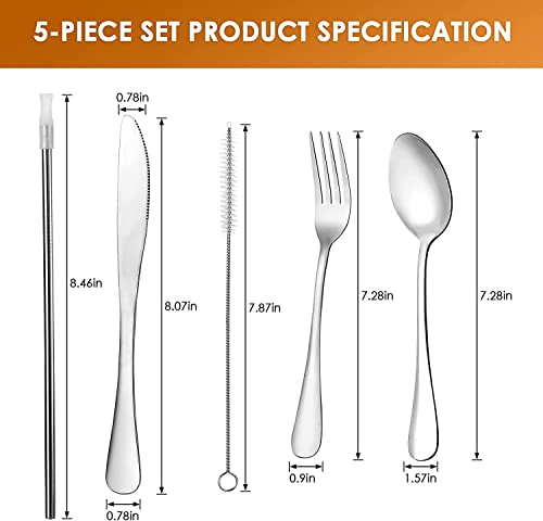 Silver Cutlery Set: This portable cutlery set includes knife, fork, spoon, straw, straw brush and one portable case, the small size makes it portable and lightweight for take anywhere. Easy to fit into backpack and pocket. Suitable for working, traveling, outdoor camping, school, picnic, etc.