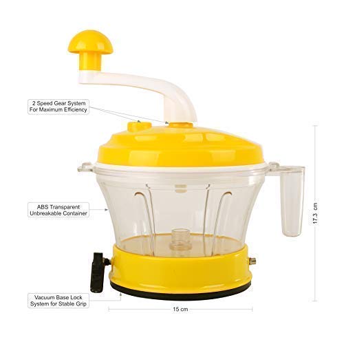 Package Content : 1 Piece Food Processor Color : Green, BlueVacuum base system for stick on floorIt Is The ldeal Kitchen Helper For Food PreparationFor Best Results, Please Use The Handle At Low-speed For 8 To 10 Times Before Switching To High-speed.Material : ABS Transparent Unbreakable Container With Vacuum Base And 100% Extra Sharp SS. Blades