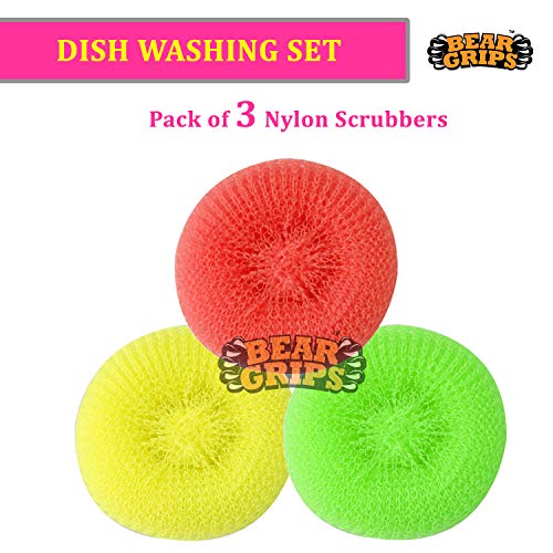 BEAR GRIPS complete dishwashing set contains – 7 Scrub Pads, 3 Sponge & Scrub sandwich pads, 1 Stainless steel scrubber, 3 Nylon scrubbers, 1 Multipurpose Nylon scrub brush and 1 Bottle Brush