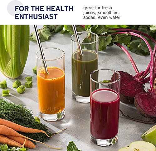 The drink glasses’ thin, cylindrical shape is easy to grasp, and their lightweight construction with thick base keeps glass from shattering while still being comfortable to hold for extended periods of time.