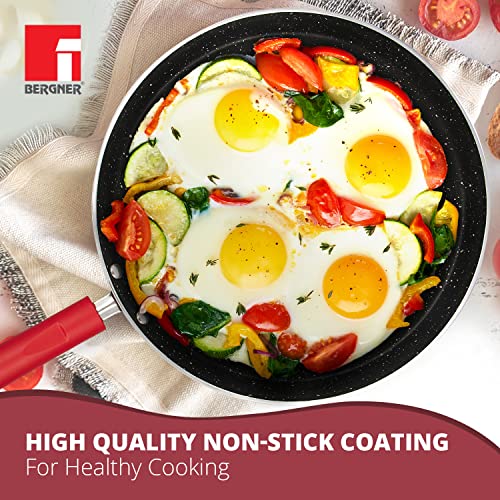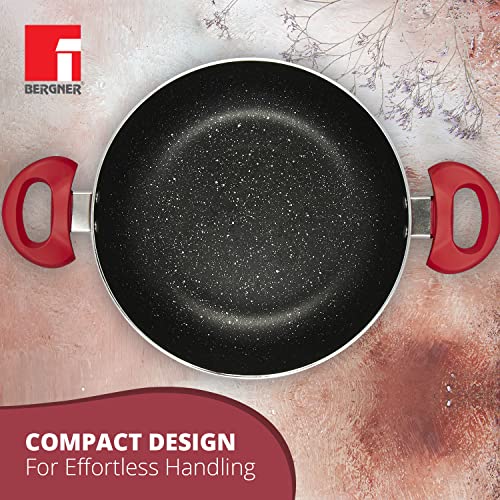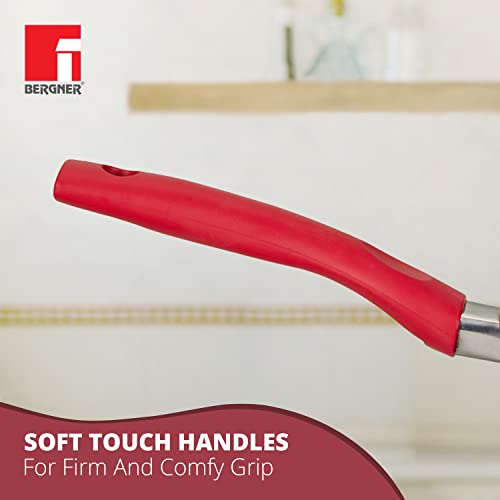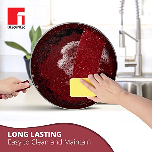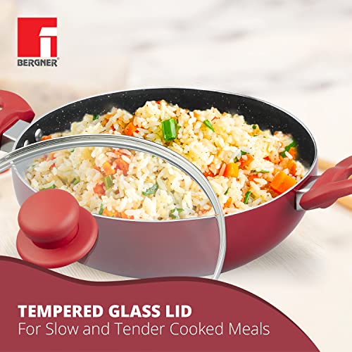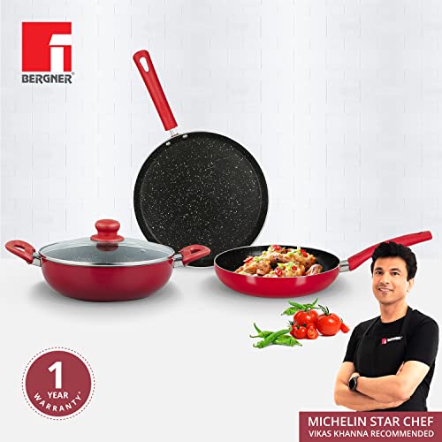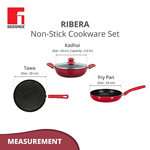 Bergner Ribera Non Stick Cookware Set, 4Pc-Kadhai with Glass Lid 2.6 L, Dosa Tawa 28cm, Frypan 24cm 1.8 L with Induction Compatible, Soft Touch Bakelite Handles, PFOA Free, Red