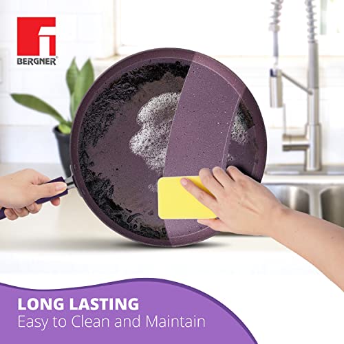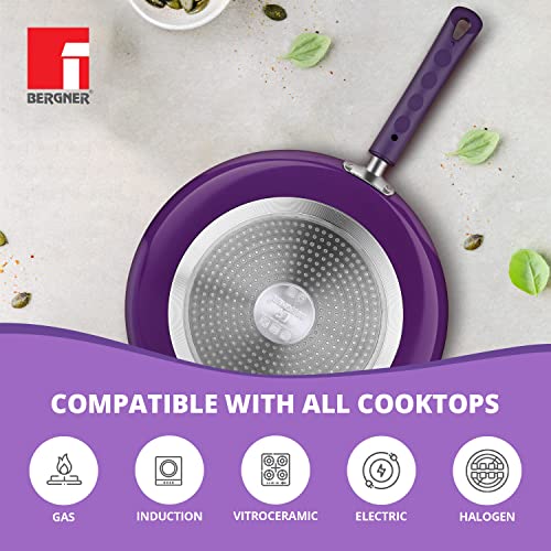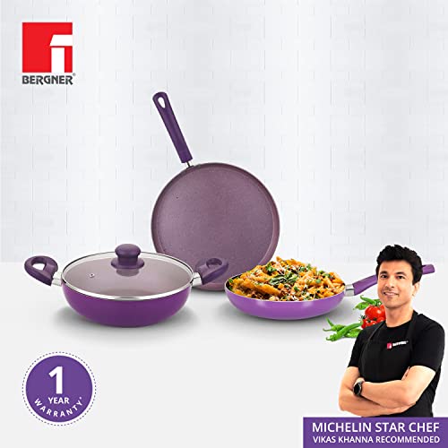 Bergner Vega Non-Stick 4Pc-Cookware Set (Kadhai with Tempered Glass Lid 2.6 L, Dosa Tawa 28cm, Fry Pan 24cm) Induction Compatible, Bakelite Handles, Free to Safe, Purple