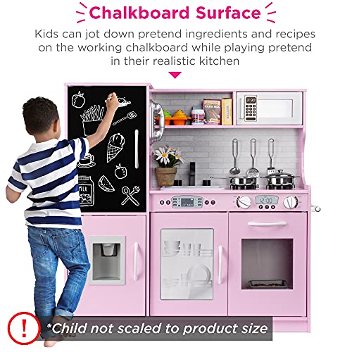 CHALKBOARD SURFACE: Little chefs can jot down notes on the included chalkboard surface as they play grownup all day with this large set made with a realistic design that mimics a real kitchen, designed for their size, and have fun playing with the ice maker, microwave, phone, and other fun features