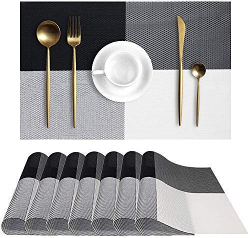This PVC Table Mats Protects Your Dining Table from Water Marks, Heat, Spills, Stains and Scratches Flexible Placemats are Easy to Roll and Store. Easily washable and Clean, They Dry Instantly Basket Weave Texture Keeps Dishes, Plates, Crockery/Cutlery from Falling Off and Breaking.Place Mats Size: 17.7×11.8 inch(45*30 cm); Package include : 6 pcs set of PVC place mats.colour-Black