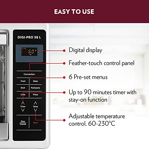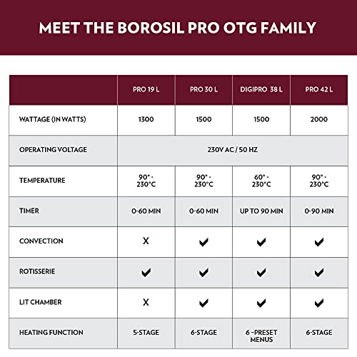 6 PRE-SET MENU OPTIONS & CONVECTION FUNCTION -The Borosil DigiPro OTG has a six pre-set menu options for you to choose from. Convection technology with 360° heat circulation helps food to cook faster and evenly.