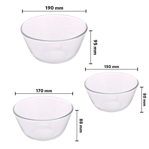 Borosil Glass Mixing & Serving Bowls, Oven & Microwave Safe Bowls, Set of 3 (500 ml, 900 ml, 1.3 L), Borosilicate Glass, Clear