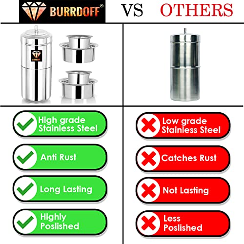 Product Description Backed by rich industry experiences; we are highly engaged in offering a premium quality range of Stainless Steel Coffee Filter By BURRDOFF Coffee . “Making a perfect cup of filter coffee is an art, that’s perfected over time” – South Indian Mothers! Instructions to Make Filter Coffee Maker Steel with Stainless Steel Coffee Filter for Home: Filter coffee is brewed using a coffee filter which has two cylinders. Top Cylinder contains Pin holes. The idea is for the ”decoction” to drip down from the top cylinder, through the tiny pin holes into the bottom cylinder. How to make a perfect south Indian coffee with our coffee filter ☛ In the upper chamber place the coffee filter then lightly tamp the powder using the pressing disc. Leave the disc in place after tamping. The powder should not be tamped as hard as espresso grounds. Now place the upper chamber on the lower one and fill the upper chamber with boiling water. Cover the coffee with filter and let it brew for 15 to 20 min. While the decoction is brewing, heat milk to a boil on the stove. When the decoction is finished, pour 1 to 2 Tbsps. Of the decoction into the dabara with milk. now add sugar as per your desire. Pour the mixture back and forth between the dabara and tumbler, using high arcing motions to pour, until the coffee is cool enough to drink. Serve in the dabara, setting it in the tumbler.