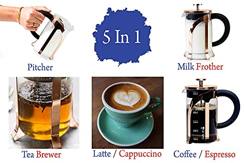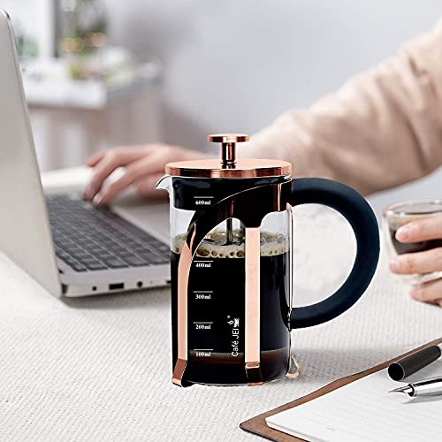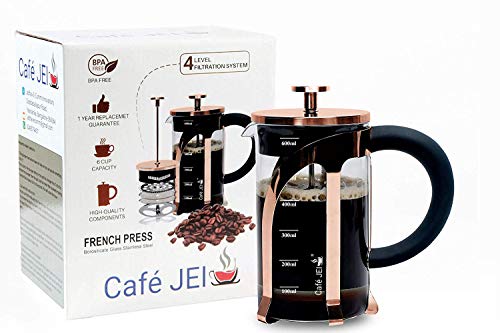Cafe JEI French Press Coffee and Black Tea Maker 600ml with 4 Level Filtration System, Heat Resistant Borosilicate Glass, Measuring Spoon, and Cleaning Tool (Rose Gold, 600ml)