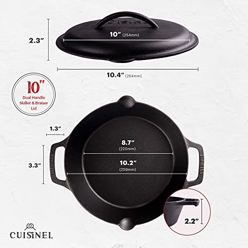 NOW WITH A HEAVY DUTY CAST IRON BRAISER LID – Cuisinel once again revolutionizes the culinary world by introducing this covered braiser style dual handle skillet. With our meticulously placed drip-points in the lid – along with even moisture and heat distribution – you can now take your cast iron wizardry to the next level by effectively turning your pan into a casserole or braiser with perfect cooking results. Pan and lid can withstand any temperatures without fear of shattering or cracking.