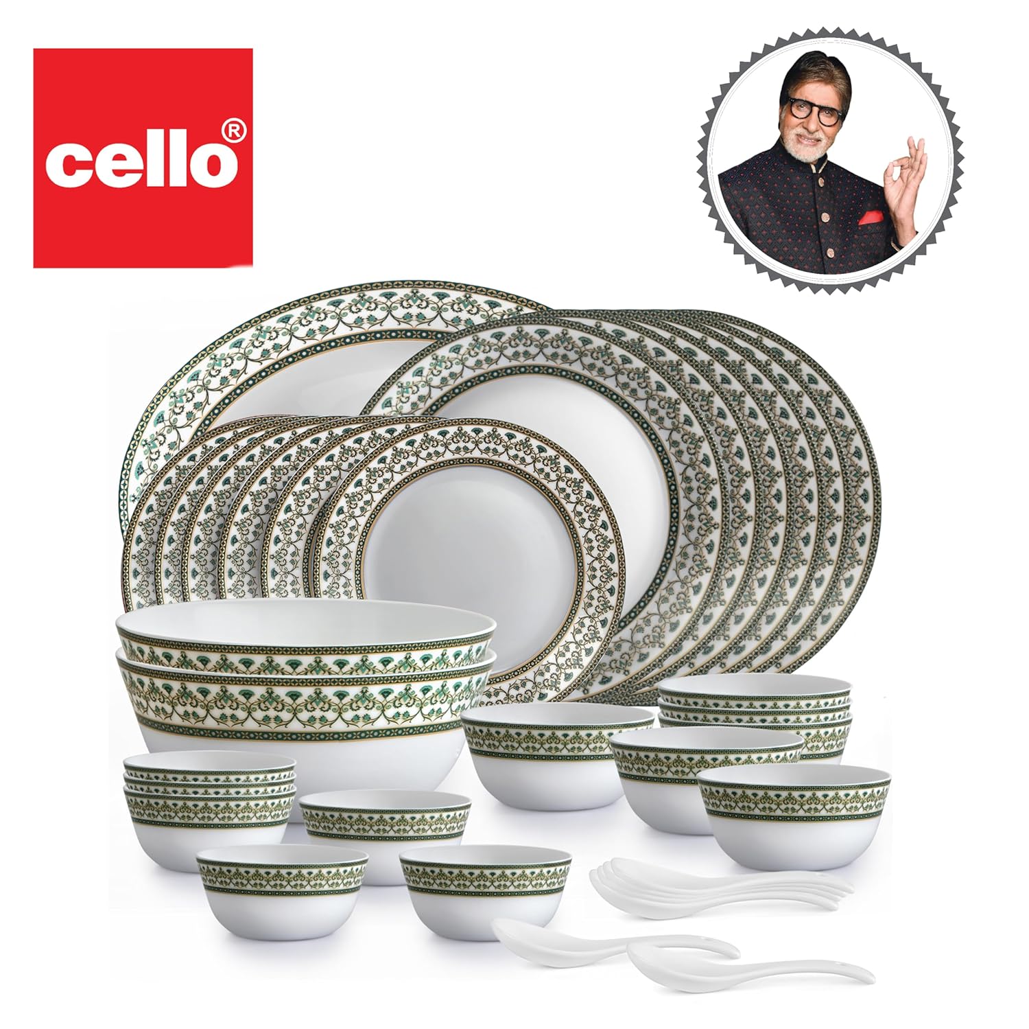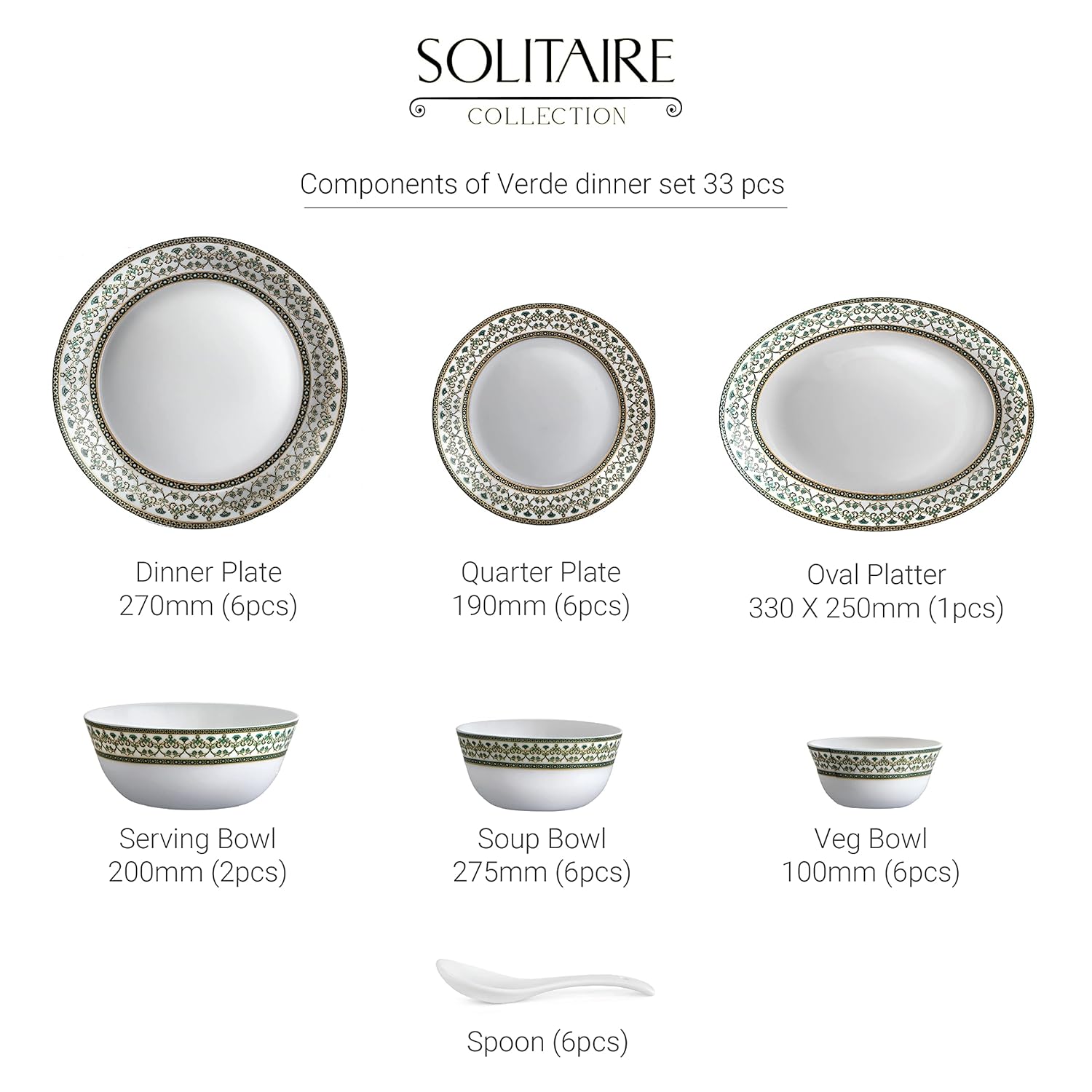 COMPOSITION: 33 Pieces Cello Dinner Set Solitaire Series is a collection of dinner set ideal for special occassions, festivals, pujas. It consists of 6-Pieces Full Plate(11 inch), 6-Pieces Quarter Plate(7 inch), 6-Pieces Veg Bowl (150ml- 4 inch), 6-Pieces Soup Bowl(6 inch), 2-Pieces Serving Bowl(7 inch), 1-Piece Oval Platter(11 inch), 6-Pieces Soup Spoons