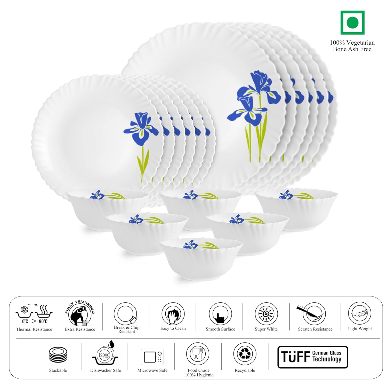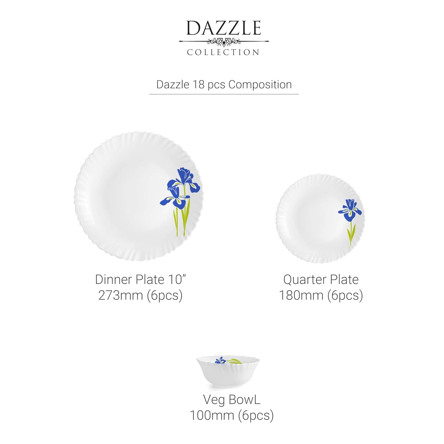 Be the first to review “Cello Opalware Dazzle Series Blue Iris Dinner Set, 18 Units | Light-Weight, Daily Use Crockery Set for Dining | White Plate and Bowl Set”