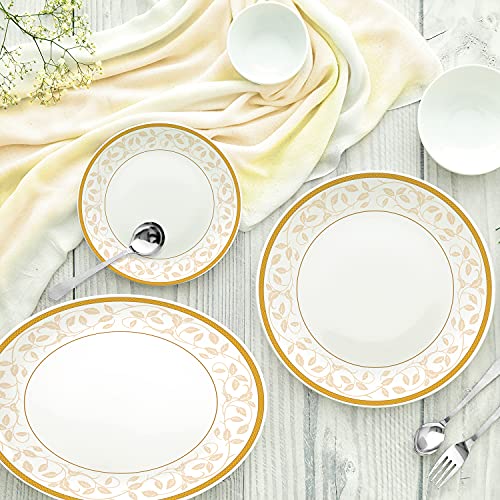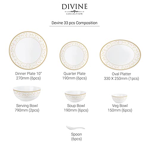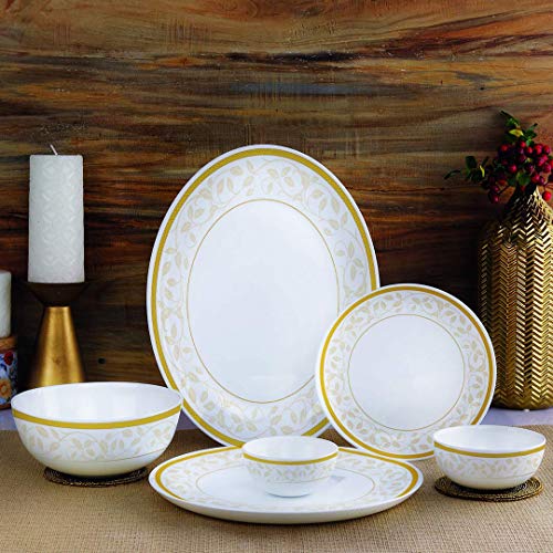 Color: White, Material: Opalware. Package Contents: dinner plate: 270mm(6pcs), quarter plate: 190mm(6pcs), veg bowl: 190ml(6pcs), soup bowl: 290ml(6pcs), serving bowl M: 790ml(2pcs), oval platter: 330x250mm(1pc), soup spoon:6pcs