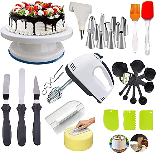 C&G INDIA® Cake Decorating Items Cake Turntable, Nozzle Set, Electronic Beater, scrapers for Cake, Measuring Cups and Spoons, Silicon Brush Spatula, Cake Smoother (White)