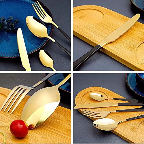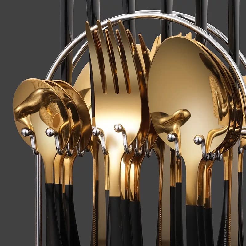 CherryBox Spoon Fork & Knife Set – Cutlery Set with Stand Mirror Polish Colour Handle- Gold Plated | Stainless Steel – 24 Pcs (Black)