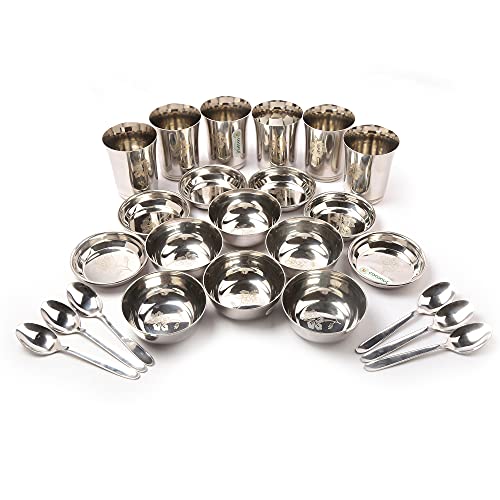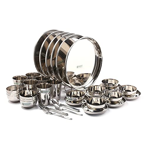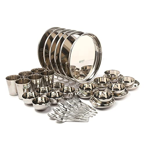 Product Content : SS Happy Dinner Set 42 Pieces Dinner Set – (Beeding Plate Thali 10”- Size 12 – 6 Pieces ) , (Amitabh Water Glass – 6 pieces), (Mukta Vati C9 Size 5 – 12 pcs), ( R3 Tea Spoon – 6 Piece), (Fork -6 Piece) & (Halwa Plate – 6 piece). (Note – Plate Rack Not included in Dinner set)
