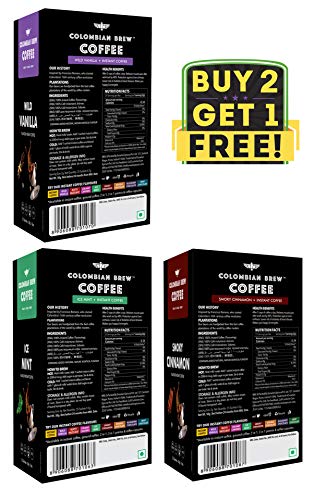 This is an elegant pack of mint instant 50g, vanilla instant 50g, cinnamon instant 50g. made with handpicked 100% pure coffee beans and cocoa beans. Colombian brew is inspired by Francisco Romero, a priest in mid-16th century Colombia that started its coffee revolution. Colombian brew coffee is sourced from best coffee bean plantations in the world.
