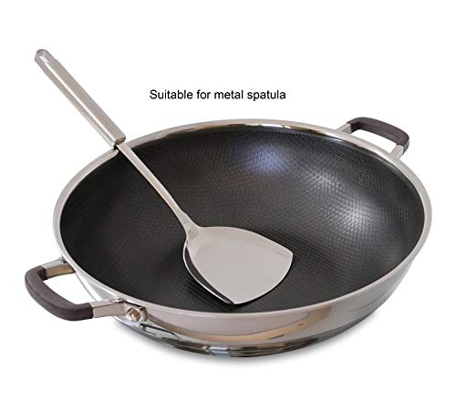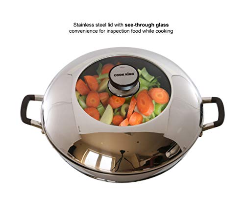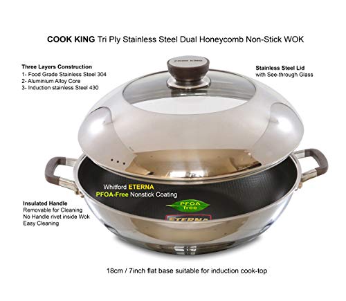 COOK KING 34cm/13.5inch Triply Stainless Steel Dual-Honeycomb Nonstick Wok/Stir Fry Pan with Glass Lid. PFOA Free
