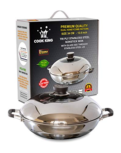 COOK KING 34cm/13.5inch Triply Stainless Steel Dual-Honeycomb Nonstick Wok/Stir Fry Pan with Glass Lid. PFOA Free