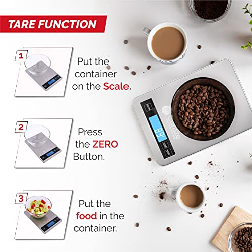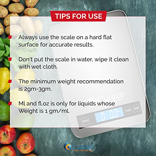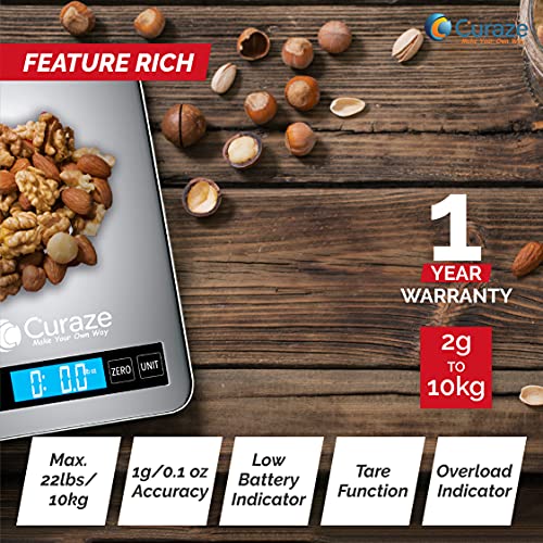 Curaze Kitchen Weighing Machine, Weight Machine for Home Kitchen (10 kg, Larger, More Sturdy), Portable Electronic Digital Food Weighing Scale for Measuring, Baking, Health and Diet, 1 Year Warranty & Batteries Included (Silver)