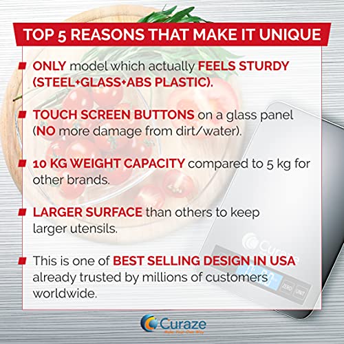 Touch screen buttons for easy operation and cleaning; Other digital kitchen scales typically have buttons which allow water and dirt to go in the scale. Curaze kitchen scale has integrated glass panel with touch buttons and LCD display.