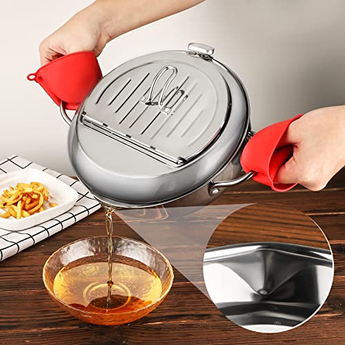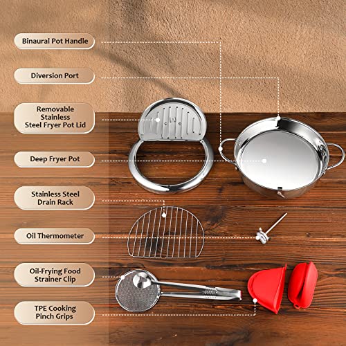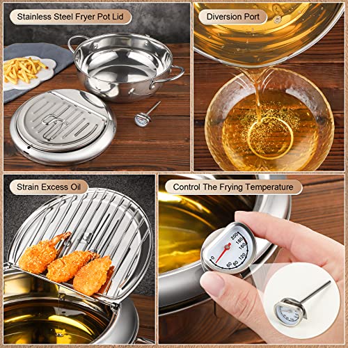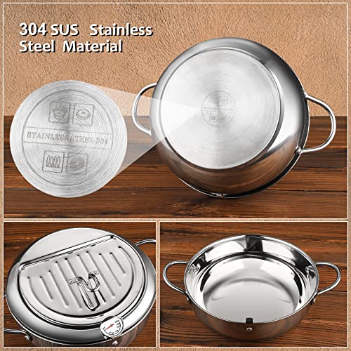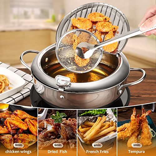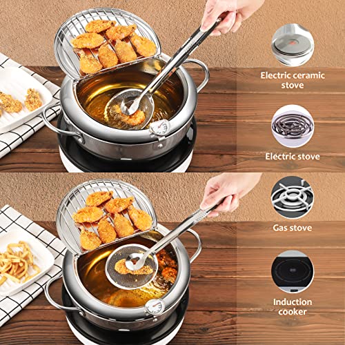 Deep Fryer Pot,Japanese Style 3.2L Deep Frying Pot 304 Stainless Steel Oil Fryer 9.7inch with Thermometer Fryer Pan with Oil Drip Rack Lid Strainer Clip and Gloves For Kitchen Cooking