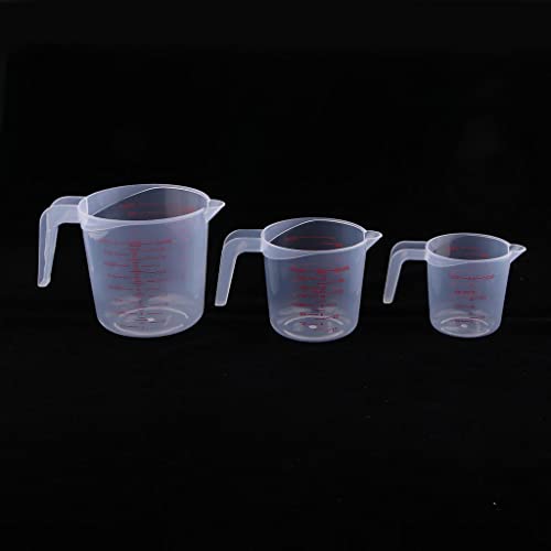 The sizes of 3pcs transparent measuring cups are 250ml, 500ml and 1000ml